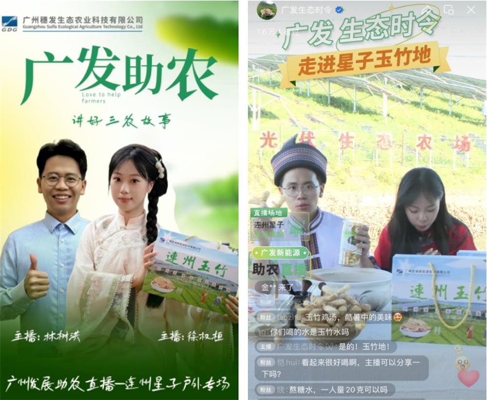 8月,农业公司成功与连州市星子镇举办户外直播助农活动,此次直播依托星子光伏电站玉竹种植区开展,是绿色光伏能源与助农工作领域相结合的一次重要创新。直播活动聚焦当地特色农产品——玉竹,深入讲述了玉竹背后的故事,并邀请地方政府领导互动访谈,现场展示玉竹挖掘、玉竹食用方法等多样化场景内容,为当地文旅业发展及农产品销售打开了更广阔的市场。9月,为推动属地村镇助农活动,农业公司还派专员现场对农户村民等免费传授新媒体电商技巧,帮助其掌握直播带货等技能,因地制宜为当地农业增收致富开辟新路径。