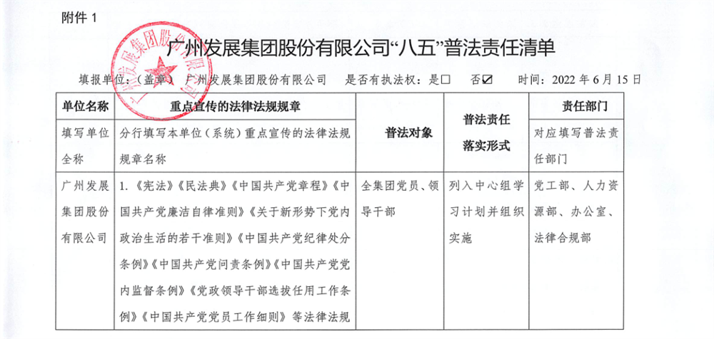 明确党委书记、董事长法治建设第一责任人职责;及时调整法治建设领导小组,统筹领导法治宣传教育工作;确定普法责任部门和人员;制定并公布普法责任清单,层层落实普法责任。制定法治企业建设规划、“八五”普法规划和年度普法依法治理工作要点,明确普法目标任务,强化法治建设情况考核、考评,确保普法任务落地见效。
