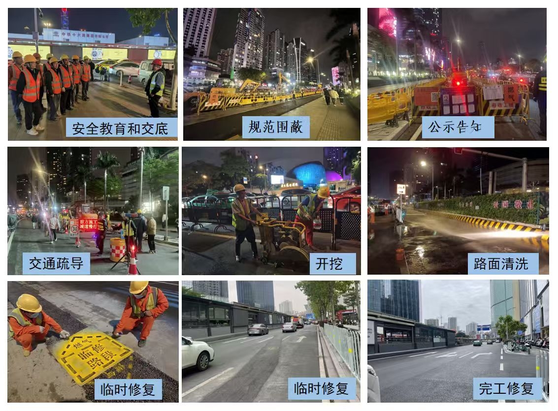 前期准备 强化沟通与合力。十五运天河赛事场馆位处市中心道路交通主命脉,周边商业综合体和居民小区密集,为赛馆输气的中压管道已长时间运行、存在老化腐蚀情况,化解安全隐患迫在眉睫。燃气东区分公司高度重视,于2024年3月起开展改造工程前期工作,积极主动对接市交通局、区城管局、交警大队、属地街道和市人防办等政府部门,广州地铁、市道路事务中心和管线单位等权属单位,以最快速度完成交通占道挖掘许可、公交场站占用审批和隧道桥梁安全评估等多项手续;并与属地街道及居委社区、小区物业等单位建立了协商沟通机制