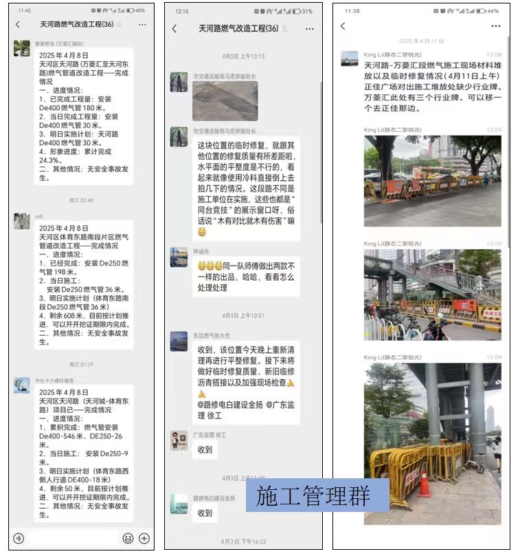 为减少施工对城市交通和市民生活产生影响,施工安排在夜间进行(晚22点至翌日6点),6点前开挖、铺管、回填和临时沥青路面修复,结束后施工机具从现场拉走,白天恢复交通通行并进行检查、复盘。施工管理首次采用夜间值班制,由2名青年党员和2名共青团员组成“2+2”青年工程管理小组,对夜间施工作业现场轮守,巡检值班。“今晚计划下管24米”“开始围蔽”“开始管沟开挖”“今天现场施工完成18米”……各项目施工管理群,每天施工路段、施工计划、施工时间和作业工序等各种进展信息、照片和视频实时更新,反映问题和求援求助,反馈快处置更快。5个工程的实施过程中,每个环节管控有效、衔接有序、零纰漏。